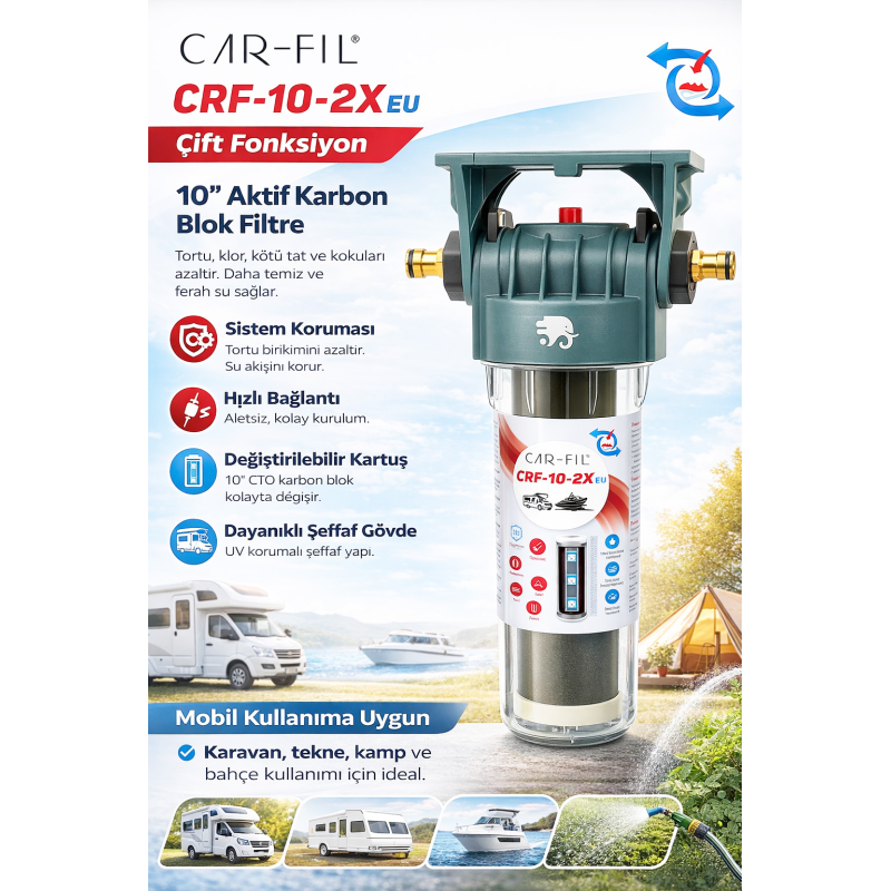 CAR-FIL CRF-10-2X -EU 10” Aktif Karbon Filtresi | Koku, Klor, Tortu Azaltma | Karavan, Tekne, Tiny House