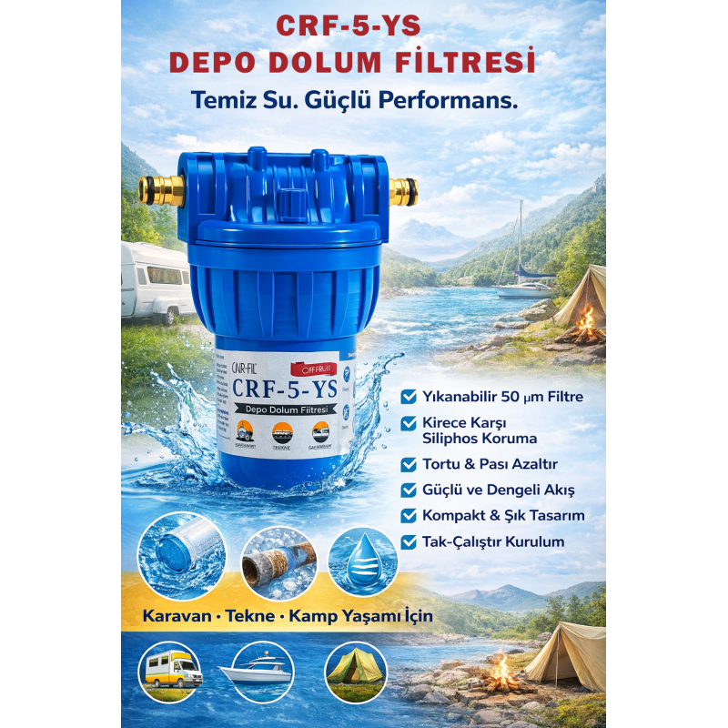 CAR-FIL CRF-5-YS, mobil su sisteminizi gittiğiniz her yerde temiz, verimli ve kireci azaltılmış halde tutar.
