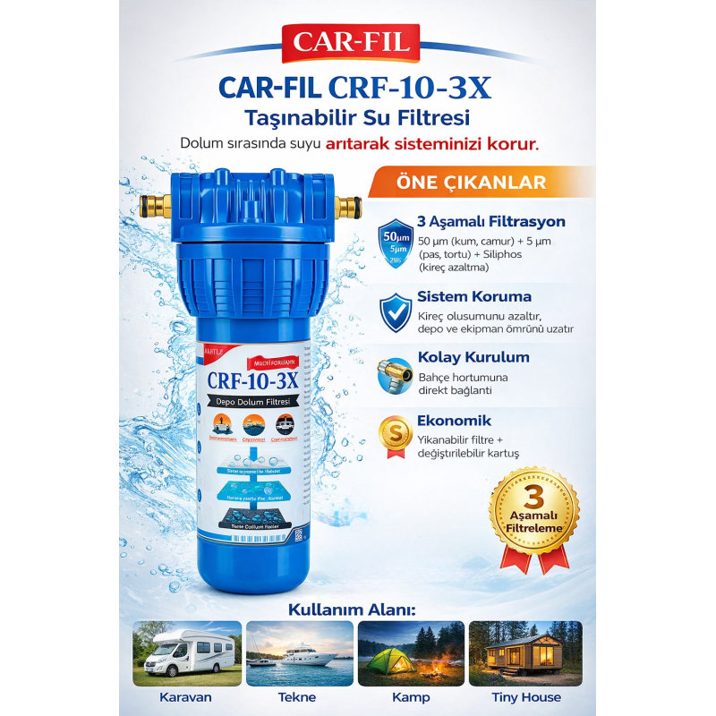 karavan su filtresi, üç aşamalı su filtresi, siliphos su filtresi, taşınabilir su filtresi, RV tortu filtresi, 10 inç su filtresi, kamp su filtresi, kireç azaltıcı filtre, CAR-FIL CRF-10-3X, bahçe hortumu su filtresi