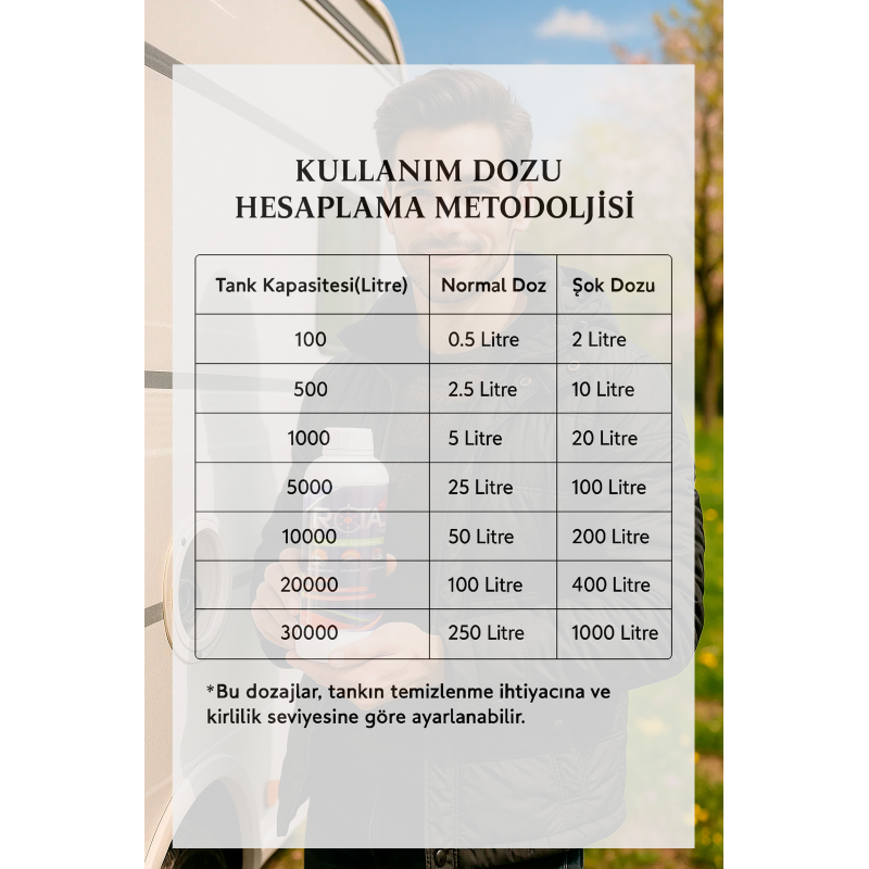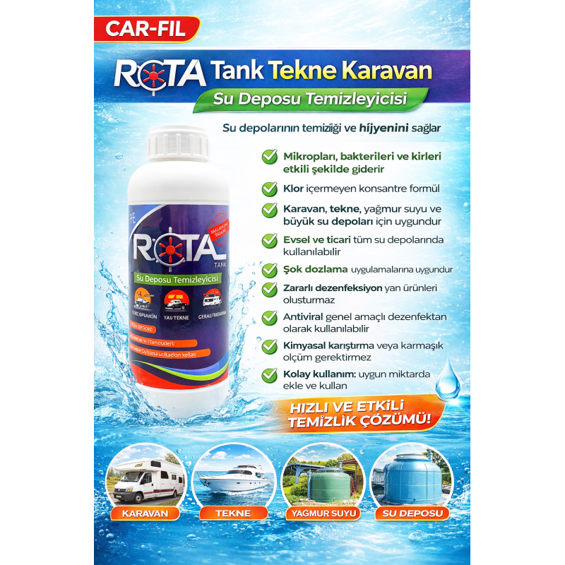 Su depolarının düzenli olarak temizlenmesi, kullanım suyunun kalitesini korumak ve sağlıklı bir ortam sağlamak için önemlidir. CAR-FİL Rota Tank, su depolarının temizliğinde aynı zamanda etkili bir dezenfektandır. Su depolarını temizler, mikropları ve kirleri etkili bir şekilde ortadan kaldırır.. CAR-FİL Rota Tank; karavan su depoları, büyük su ve yağmur suyu depoları için konsantre, klor içermeyen bir temizleme, dezenfekte maddesidir.