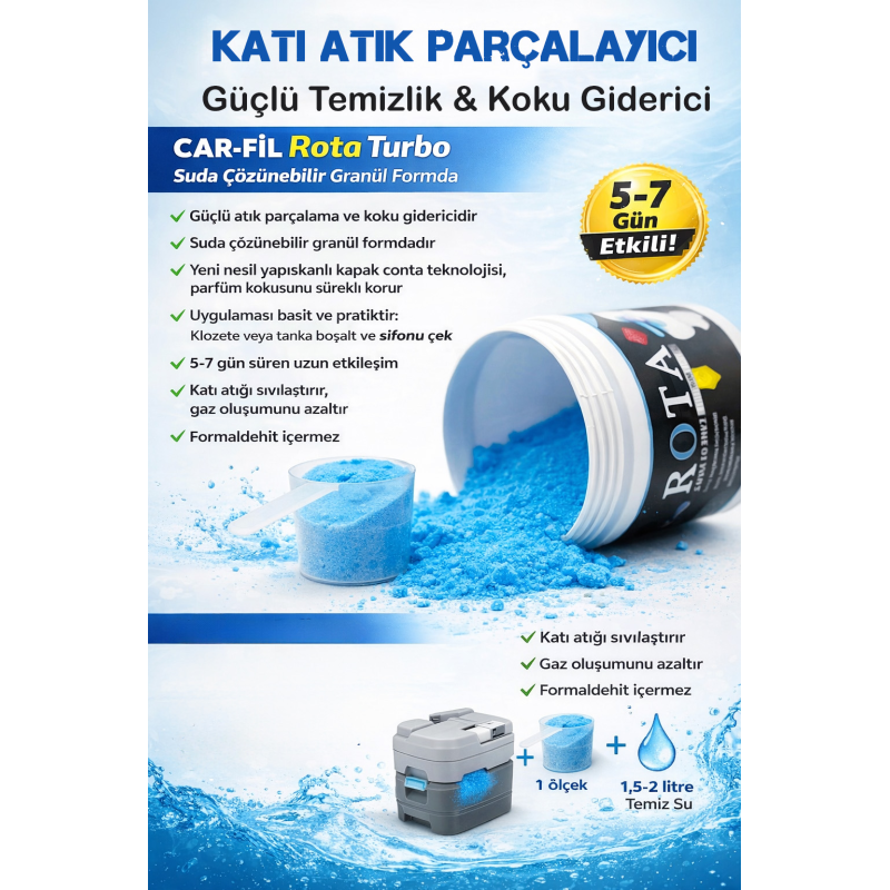 Boş atık tutma tankının içerisine her 20 litre için 1 ölçek CAR-FİL Rota Turbo koyun. 1,5-2 litre temiz su ekleyin ve tankın kapağını kapatın. Tankı tuvalete yerleştirin ve kullanıma hazır hale getirin. Günlük rutin kullanımda 5-7 gün sonrasında tank boşaltılmalıdır.