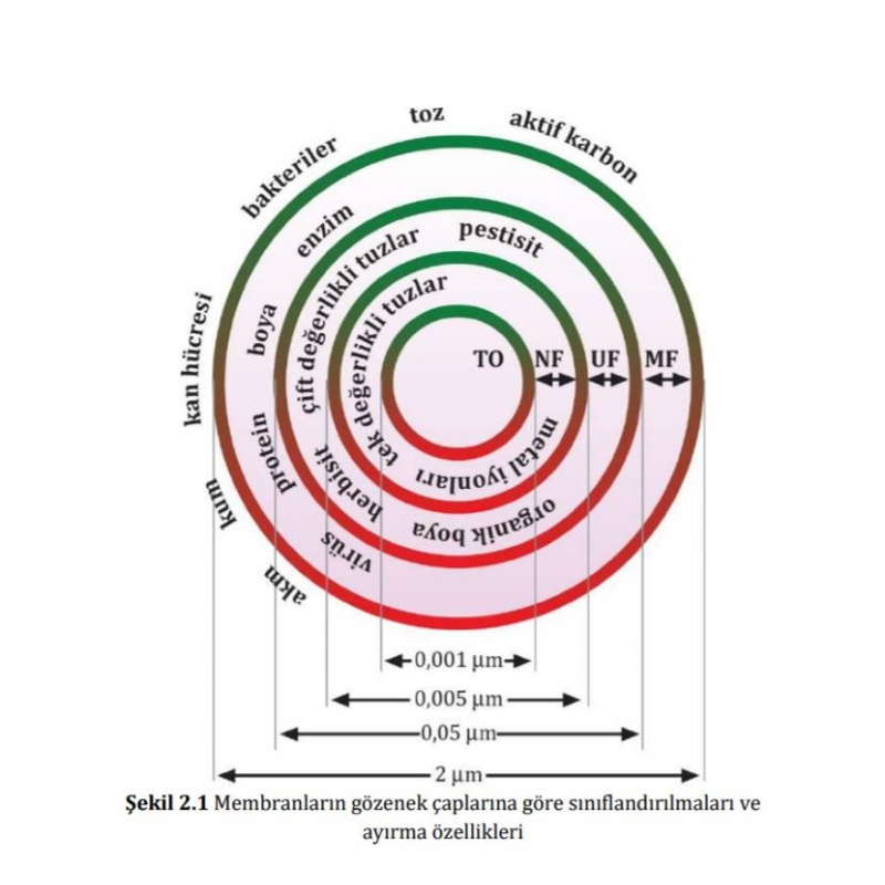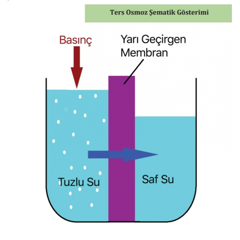Membran Filtre Ters Osmos yöntemiyle ozmotik basınçtan daha büyük bir basınç uygulandığında yarı geçirgen olan ve içinde 5 Angostrom boyutunda delikler bulunan membran sadece saf suyu geçirirken bakterileri, pirojenler, organik maddeler, askıda katı maddeler, erimiş tuzlar, nitrit, alüminyum ve ağır metalleri tutar, suyunuzda olabilecek sert su kontaminantları ortadan kaldırır.